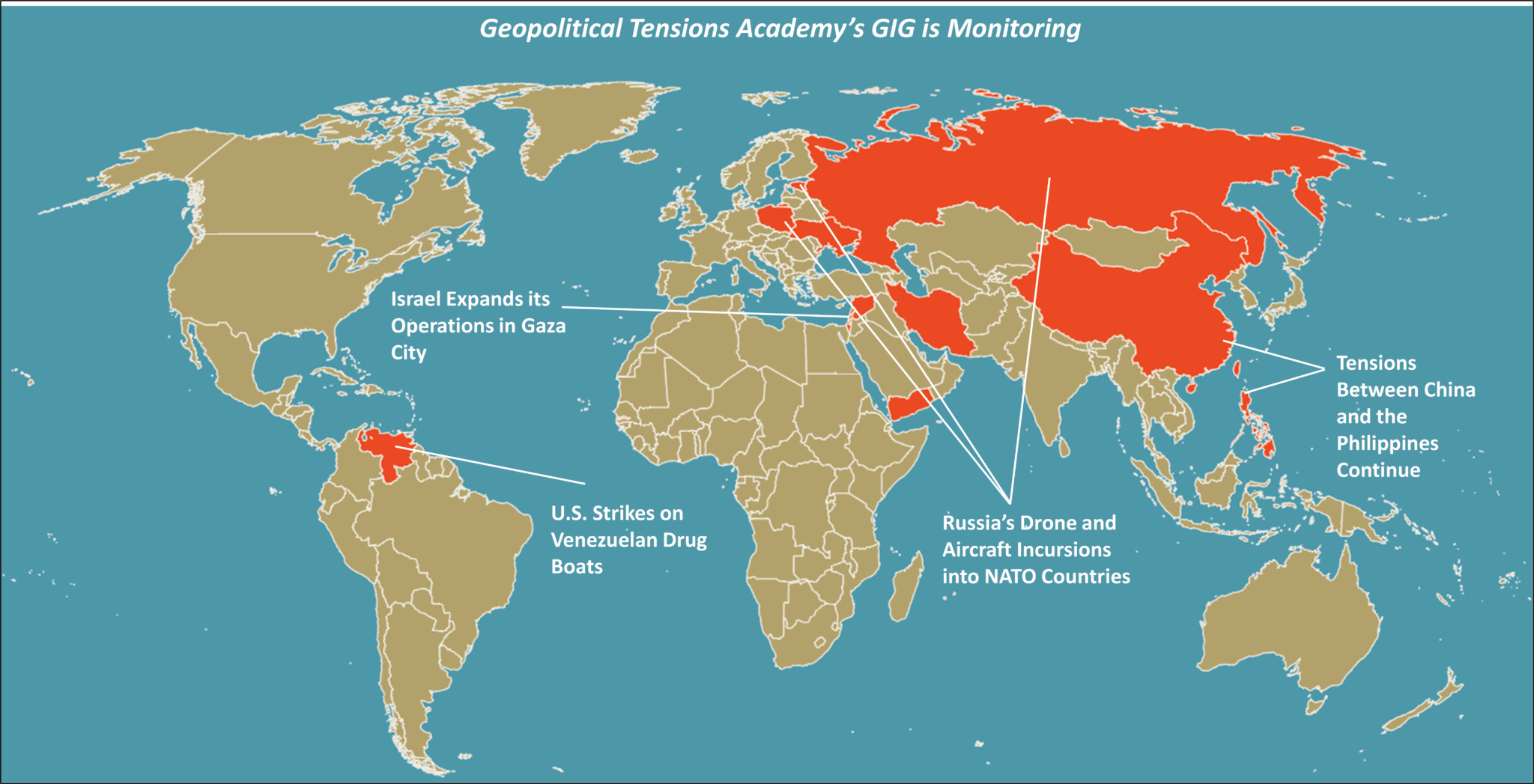 We kick off this month’s ATW with an update on the Russian drone and aircraft incursions into Poland and Estonia in the last two weeks. These were likely probing incidents designed to test NATO’s readiness and resolve. Next we address the latest updates regarding the Israeli operation to occupy Gaza City in an effort to defeat Hamas and end the war. The IDF’s air strike into Doha targeting Hamas leadership was a clear signal that in Netanyahu’s mind, the time for negotiations with Hamas is over. Next we address the tensions in the South China Sea between China and the Philippines. Following yet another incident between the two nations, it is clear that China is stepping up their operations in the region, especially after their Victory Day Parade earlier this month. We also address the recent strikes against drug boats from Venezuela in international waters as U.S. forces in the region continue to target these vessels in an effort to stop the flow of drugs from Venezuela. Finally, on the cyber front, we wanted to highlight a point from General Mary O’Brien from our GIG who said, “The Cybersecurity Information Sharing Act, which was a cornerstone of U.S. cybersecurity policy passed in 2015, expires on September 30th without Congressional reauthorization. The legislation’s liability protections permitted banks and investment firms to share threat intelligence with federal agencies without regulatory backlash. This represents a critical vulnerability for the financial services industry amid escalating cyber threats projected to cost the global economy $10.5 trillion annually.” We will continue to monitor the cyber landscape especially in light of the recent attacks in Europe.