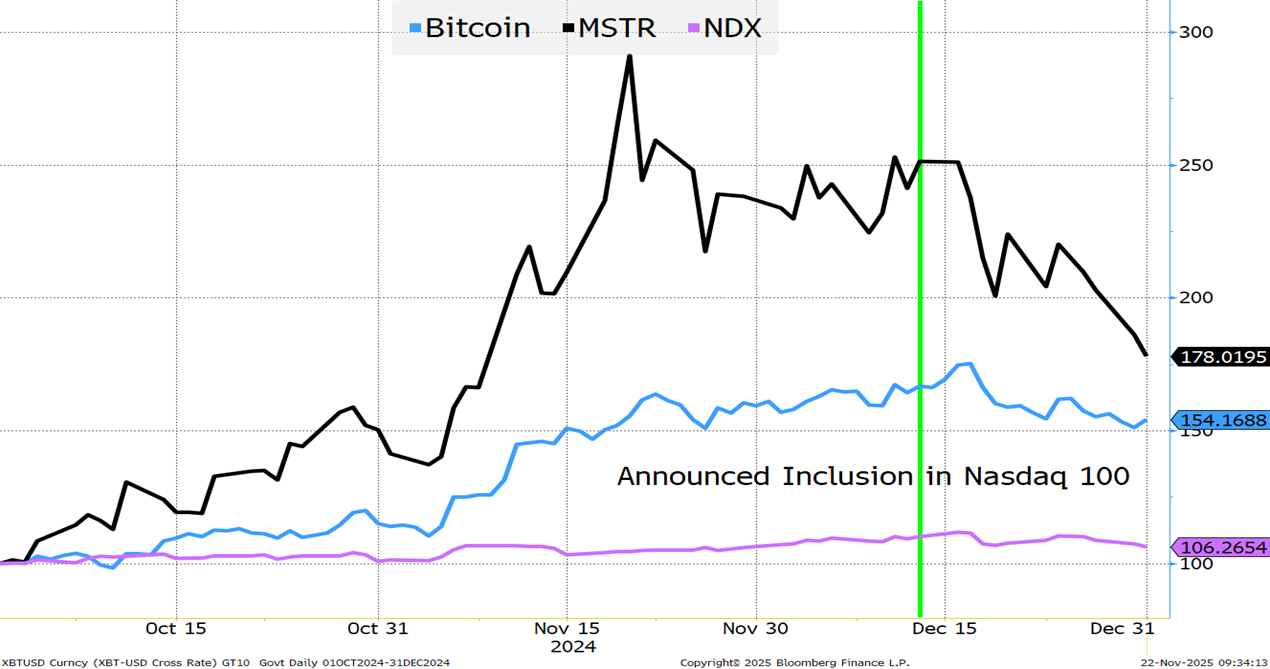 We’ve included this chart because it highlights how positive these types of announcements can be. Bitcoin and MSTR traded extremely well as speculation grew that MSTR would be included in the Nasdaq 100. It was announced on December 13th, 2024 and went into effect on December 23rd, 2024.