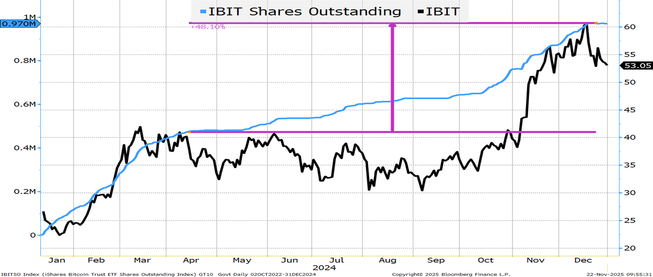 From IBIT’s inception, on January 10th, 2024 (it seems longer than that), it reached 760 million shares by November 2024. It got to over 1.4 billion shares outstanding by April 2024. It peaked at over 1.4 billion shares. Almost every purchase since then is down. About half of the shares outstanding were issued to buyers above today’s prices. That could cause some selling pressure.