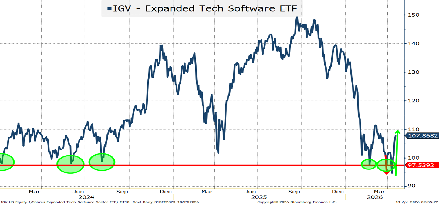 IGV (software ETF) rose 14% on the week. ARKK which I use as a “proxy” for disruption, also rallied by 15%. INTC (one of the few individual tickers I’ve been vocal about in reports and the media) said “hold my beer” as it rallied 35% in less than 2 weeks! QTUM (quantum ETF) was up 25% and didn’t sell off as much in the first place – which makes some sense as investment into this area is only increasing.
