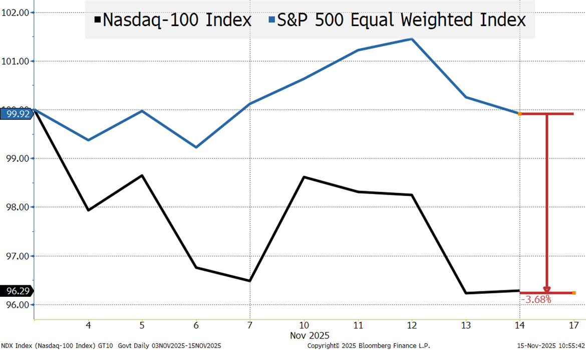 - Increasing “concern” about how much debt needs to be raised to build out data centers, AI, and the electricity generation capacity to power those data centers. Not alarming and will play out over time, but this will weigh on credit spreads.