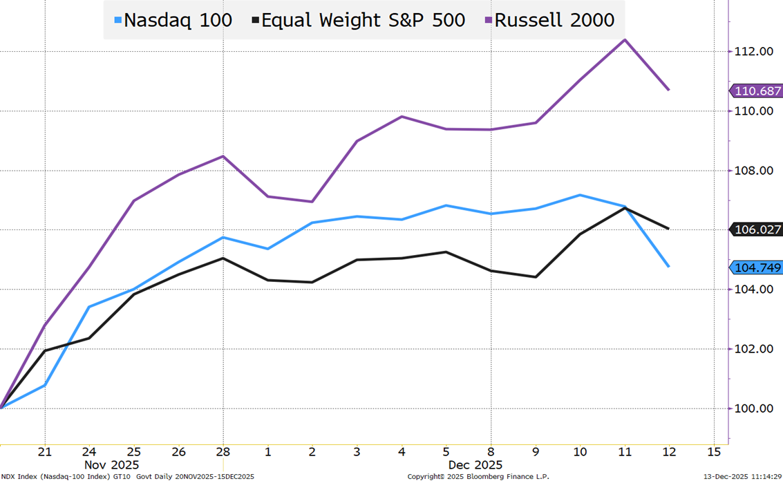Since November 20th, we’ve seen the Nasdaq 100 lag (still up, but lagging) while the Russell 2000 has been the star of the show.