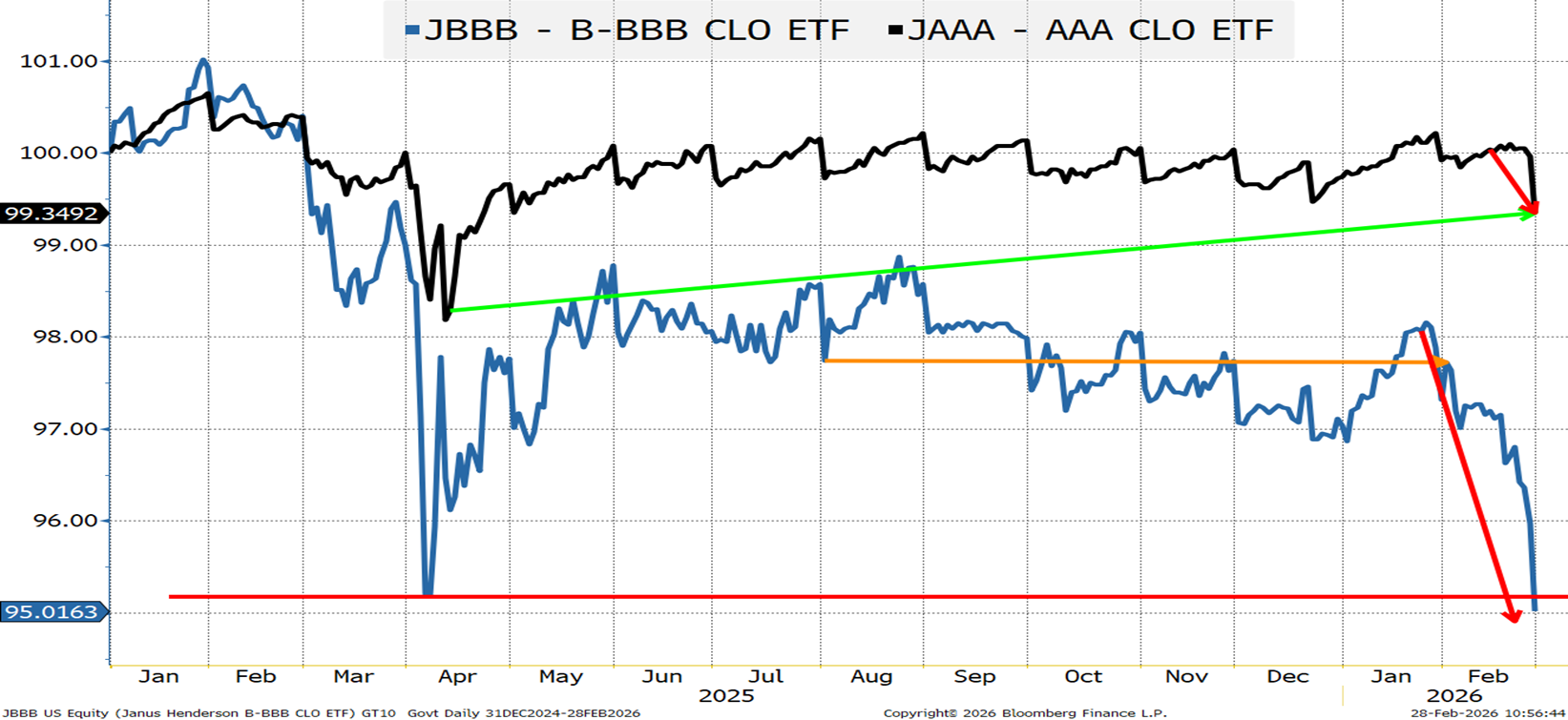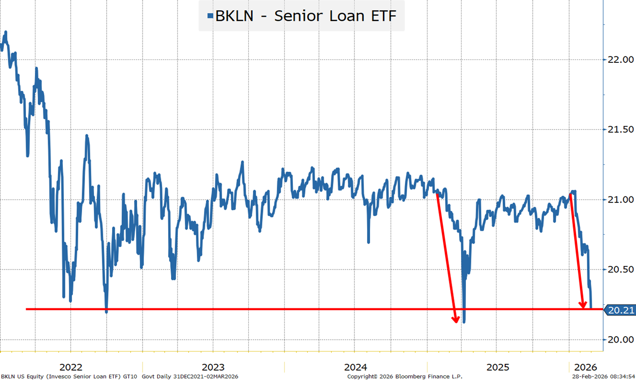 Anything below Liberation Day levels warrants extra attention. Liberation Day was a largely “self-inflicted surprise” that ultimately the admin largely backed away from. This is a bit more worrisome. The sell-off started in Q4, but only now appears to be “rattling” credit markets (BKLN didn’t start selling off until the middle of January). My argument would be that the first part of the “correction” was a valuation adjustment. It is exactly why we had more concerns about stocks than credit. Equity valuations were so strong in some sectors that you could have equities come under pressure, without corresponding pressure on credit. But as that “valuation buffer” erodes, credit and equities will move more in line.