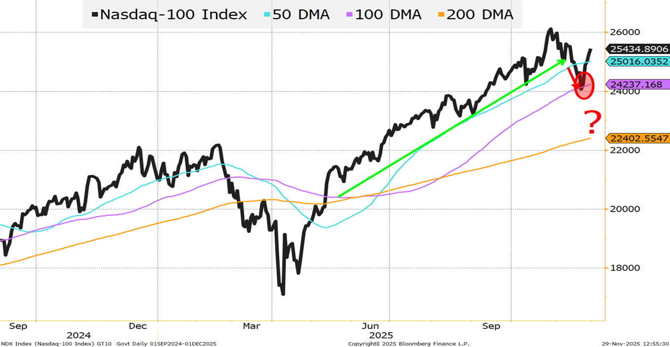 - The Nasdaq 100 is up 5.7% (outpacing the “rotation” trade of the S&P 500 Equal Weight which is up 3% in those same trading days).